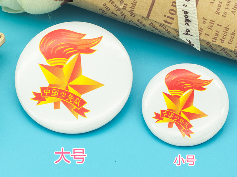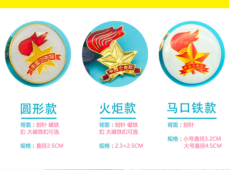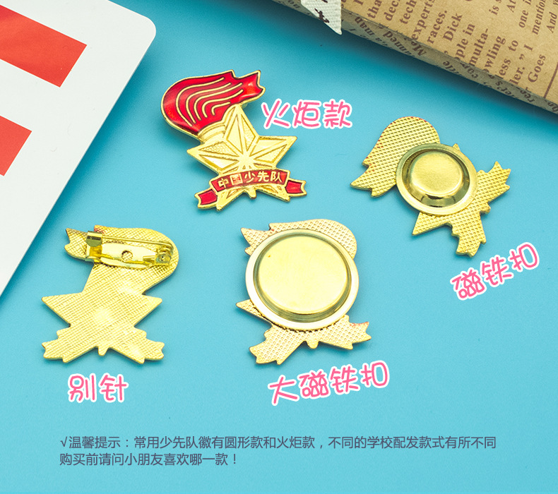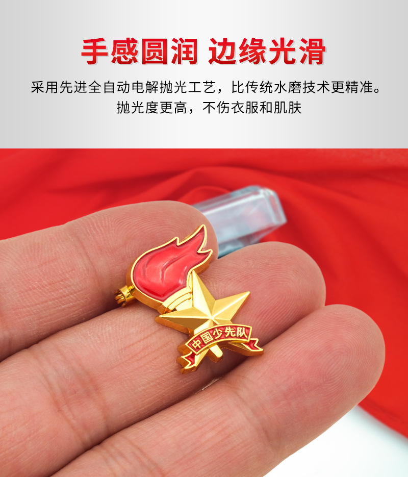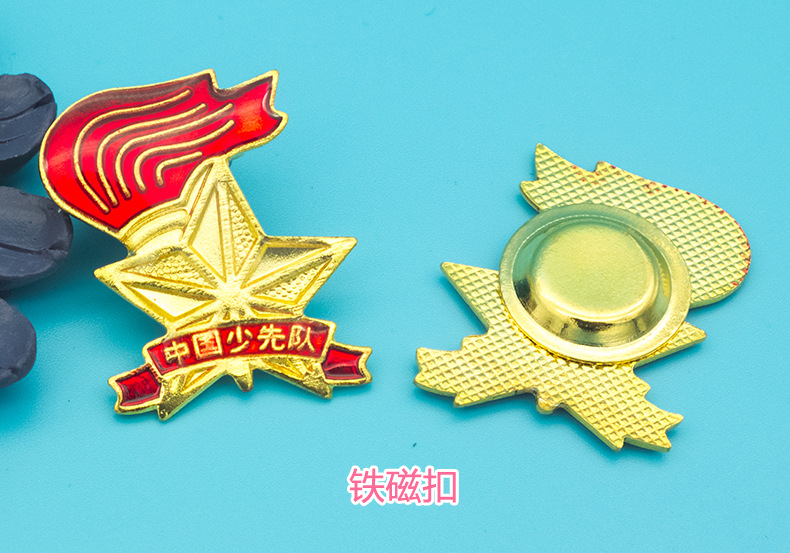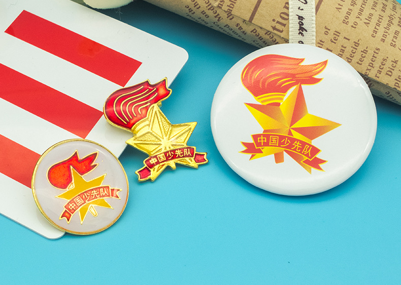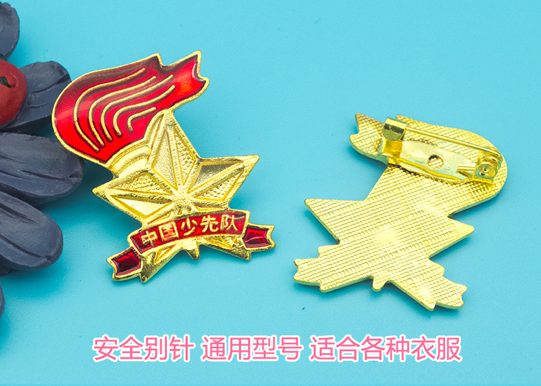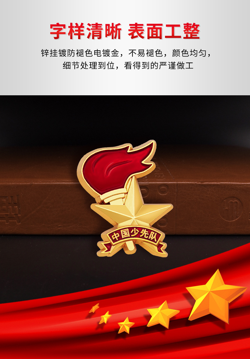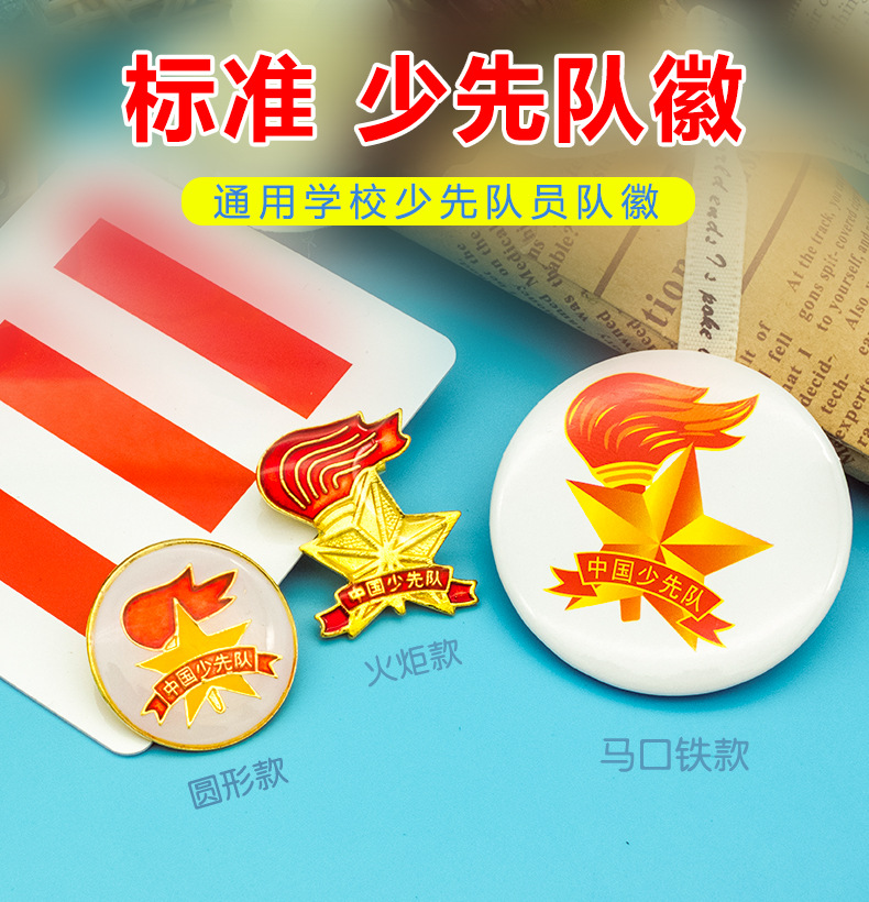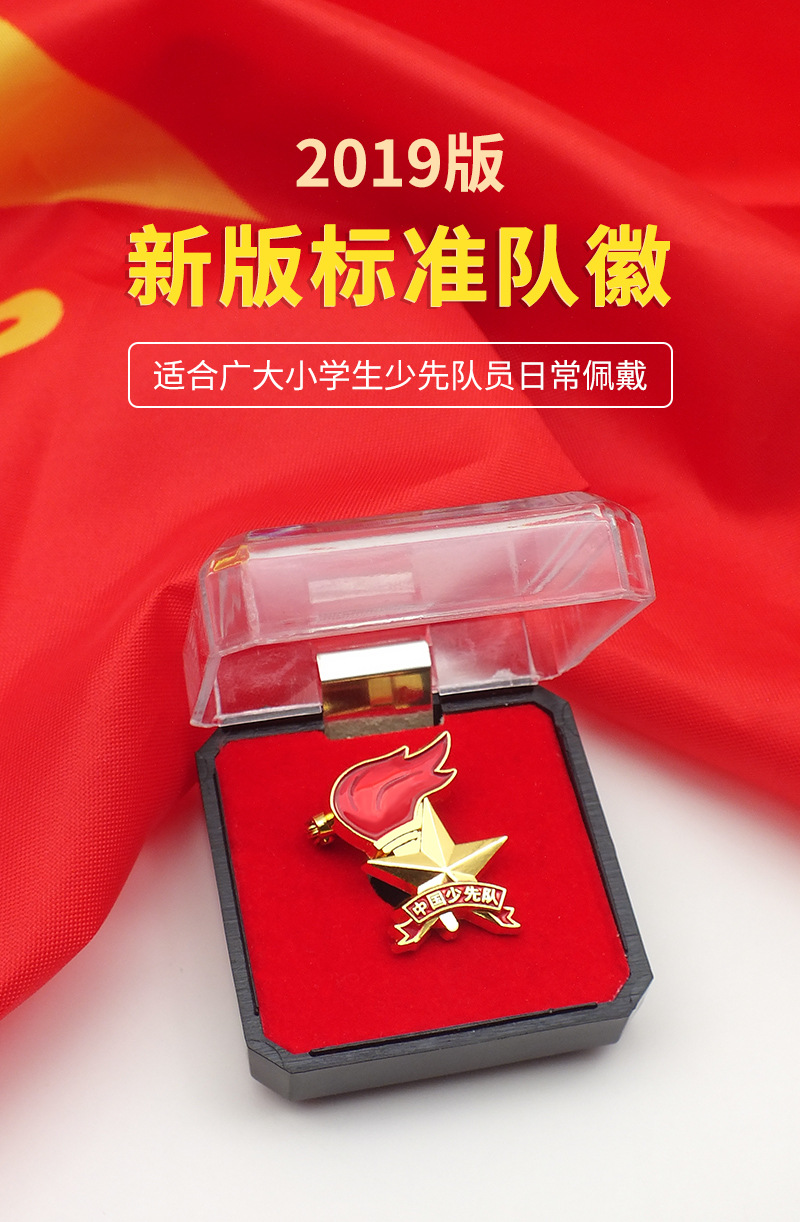 五角星加火炬和写有“中国少先队”的红色绶带组成少先队队徽。五角星、“中国少先队”五个字和火炬柄为金色,绶带和火炬的火焰为正红色,火焰和绶带镶金边,“中国少先队”字体为黑体。