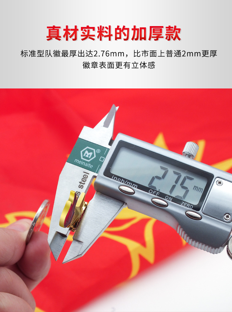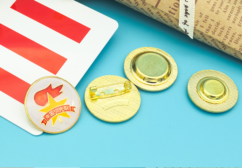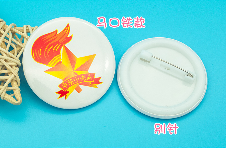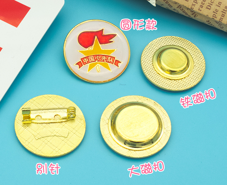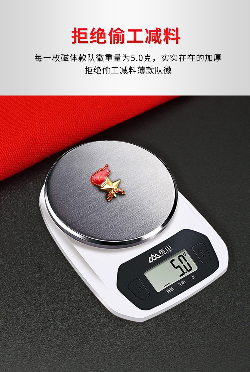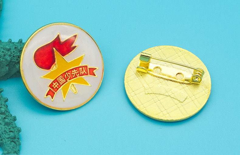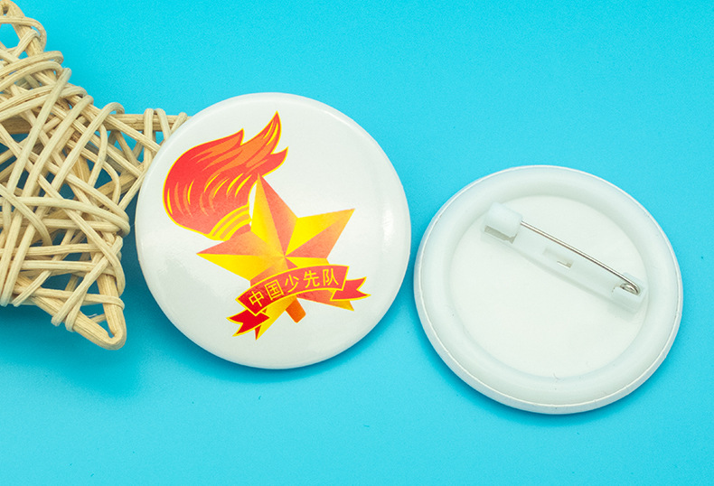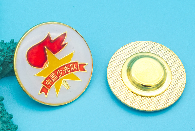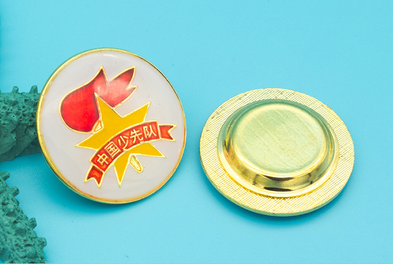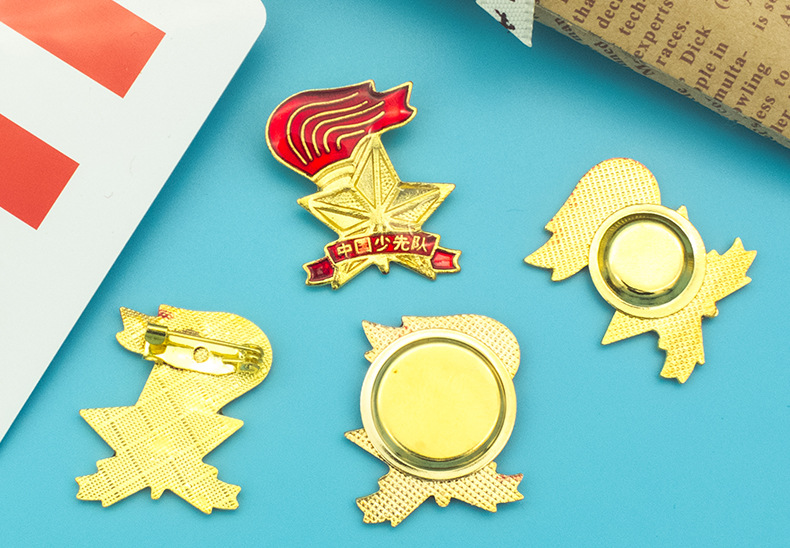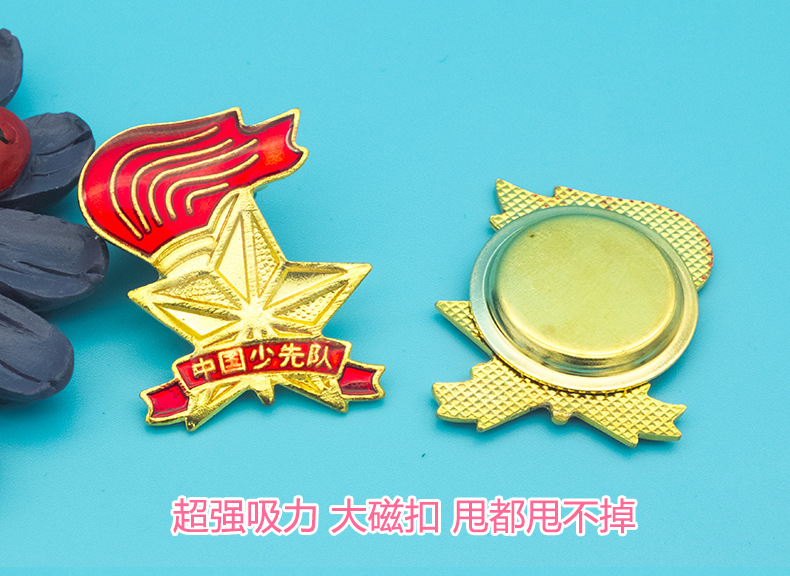 五角星加火炬和写有“中国少先队”的红色绶带组成少先队队徽。五角星、“中国少先队”五个字和火炬柄为金色,绶带和火炬的火焰为正红色,火焰和绶带镶金边,“中国少先队”字体为黑体。