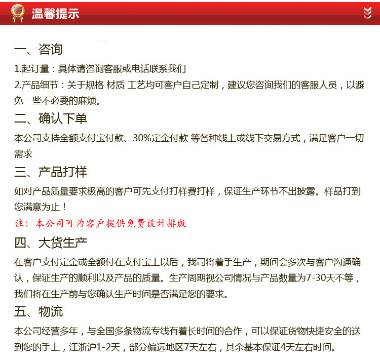【货款】双方确认图稿后,请将货款拍付本店(支付宝提保交易),我们提供产品数码样给您查看,您确认后我方才可安排大货的生产。