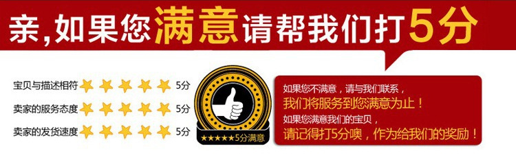 【评价】在收到货后,请及时去“已买到的宝贝”确认到货,如果您对我们的货品和服务都满意,请打五分并给个好评。如您对收到的商品有任何疑问,请不要急着给中评或者差评,请务必和我们联系,我们一定会给您一个满意的答复,未能做到至善至美,敬请谅解,我们努力做到更好。