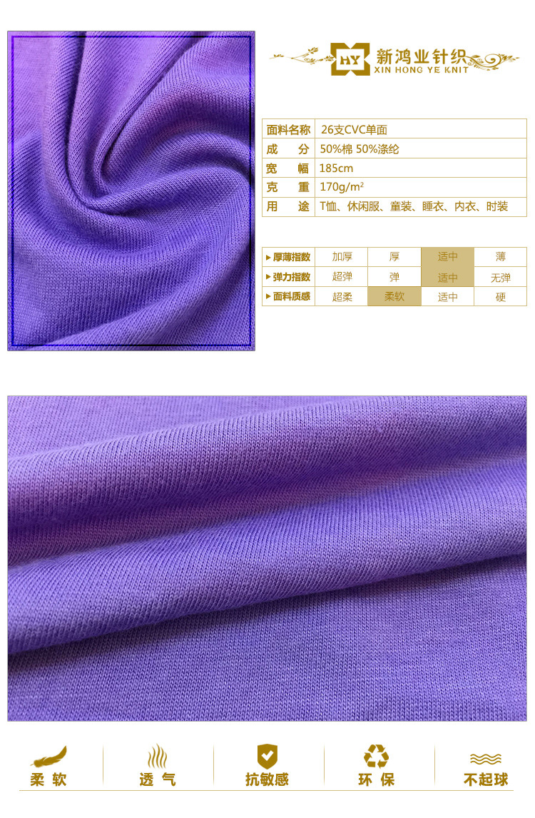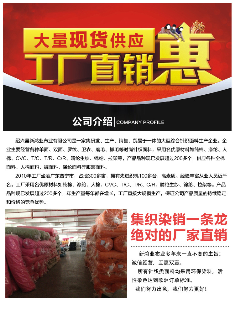 绍兴县新鸿业布业有限公司是一家集研发、生产、销售、贸易于一体的大型综合针织面料生产企业。企业主要经营各种单面、双面、罗纹、卫衣、磨毛、抓毛等时尚针织面料,采用名优原材料如纯棉、涤纶、人棉、CVC、T/C、T/R、C/R、腈纶生纱、拉架等,产品品种现已发展超过200多个,供应各种全棉面料、人棉面料、裤面料、涤纶面料等服装面料。