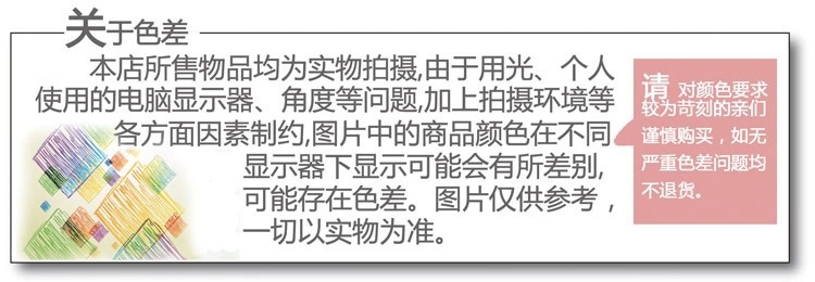1:图片都是实物拍摄,可能因像素问题和每批货不一样会出现色差要求很严的客人请联系客服寄实样再拍。